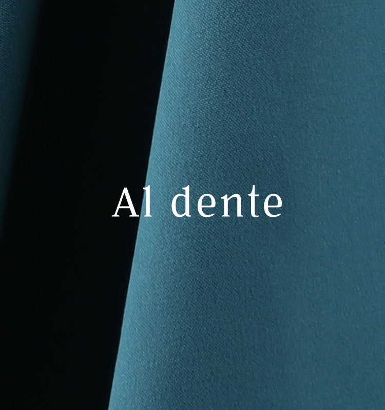 Al dente(アルデンテ)とは、ビスコースの芯糸に特殊なカバーリング方法でポリエステルを巻き付けた糸を使用した素材のシリーズです。 通常ビスコースを使用した素材は、水洗いに対して縮率が不安定ですが、この糸を使用することで縮率を安定させています。ビスコースのドレープ性と、ポリエステルの適度な反発感を併せ持った、仕立て映えの良さも特長のひとつです。