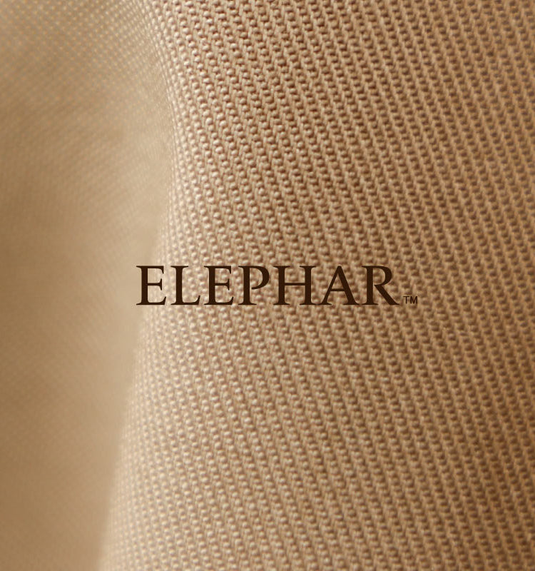 ELEPHAR(エレファー)は、サイロ紡績とヒートセット加工を施し、エレガントさと快適さを併せ持った複合素材です。サイロ紡績糸を使用しているため従来の同番手の糸と比べ毛羽が少なく、非常に綺麗な目面に仕上がります。また、ヒートセット加工時に素材の風合いや生地の密度を調整することで、適度なしなやかさを残しながら膨らみ感を持たせています。