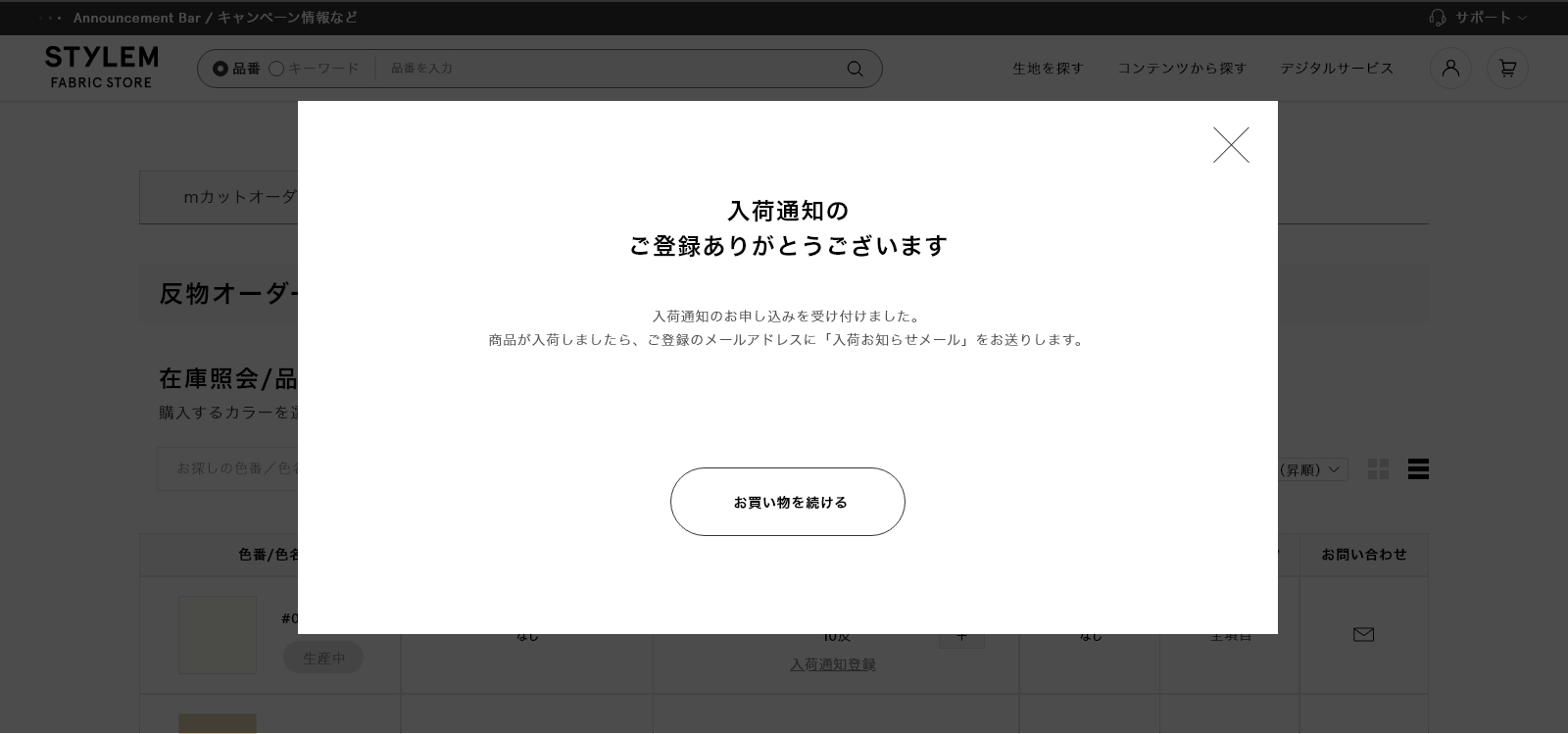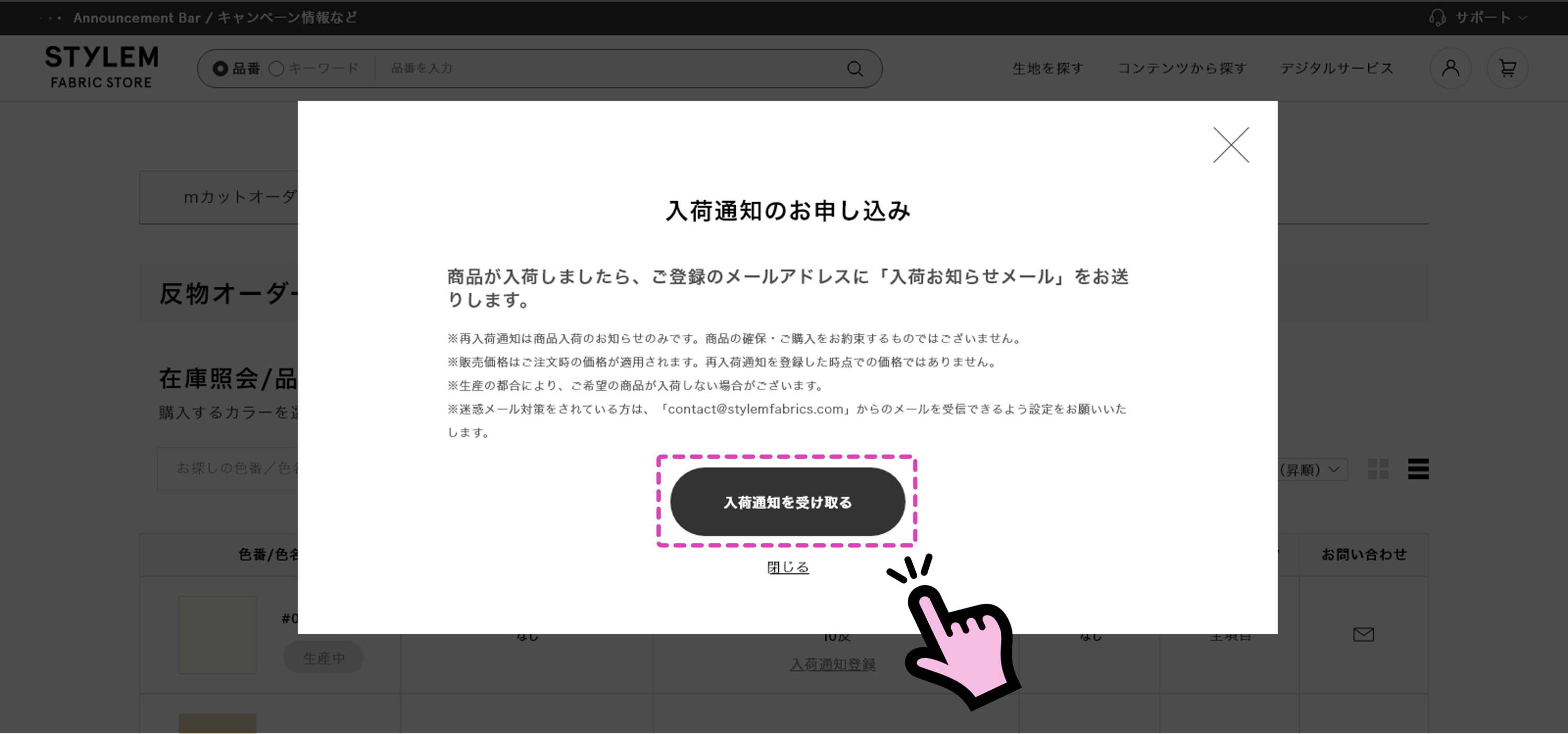 - 迷惑メール対策をされている方は、「contact@stylemfabrics.com」からのメールを受信できるよう設定をお願いいたします。
