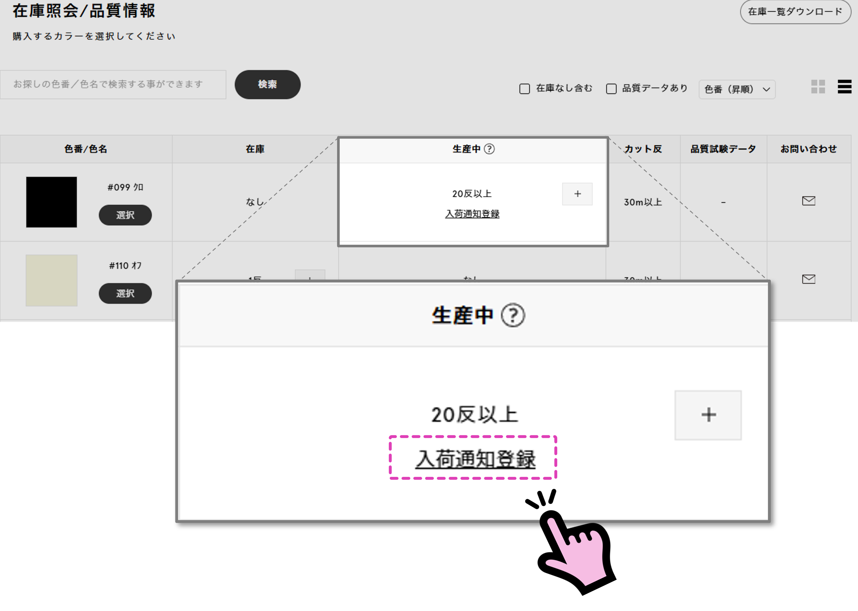 色ごとに在庫状況、品質情報をご確認いただけます。