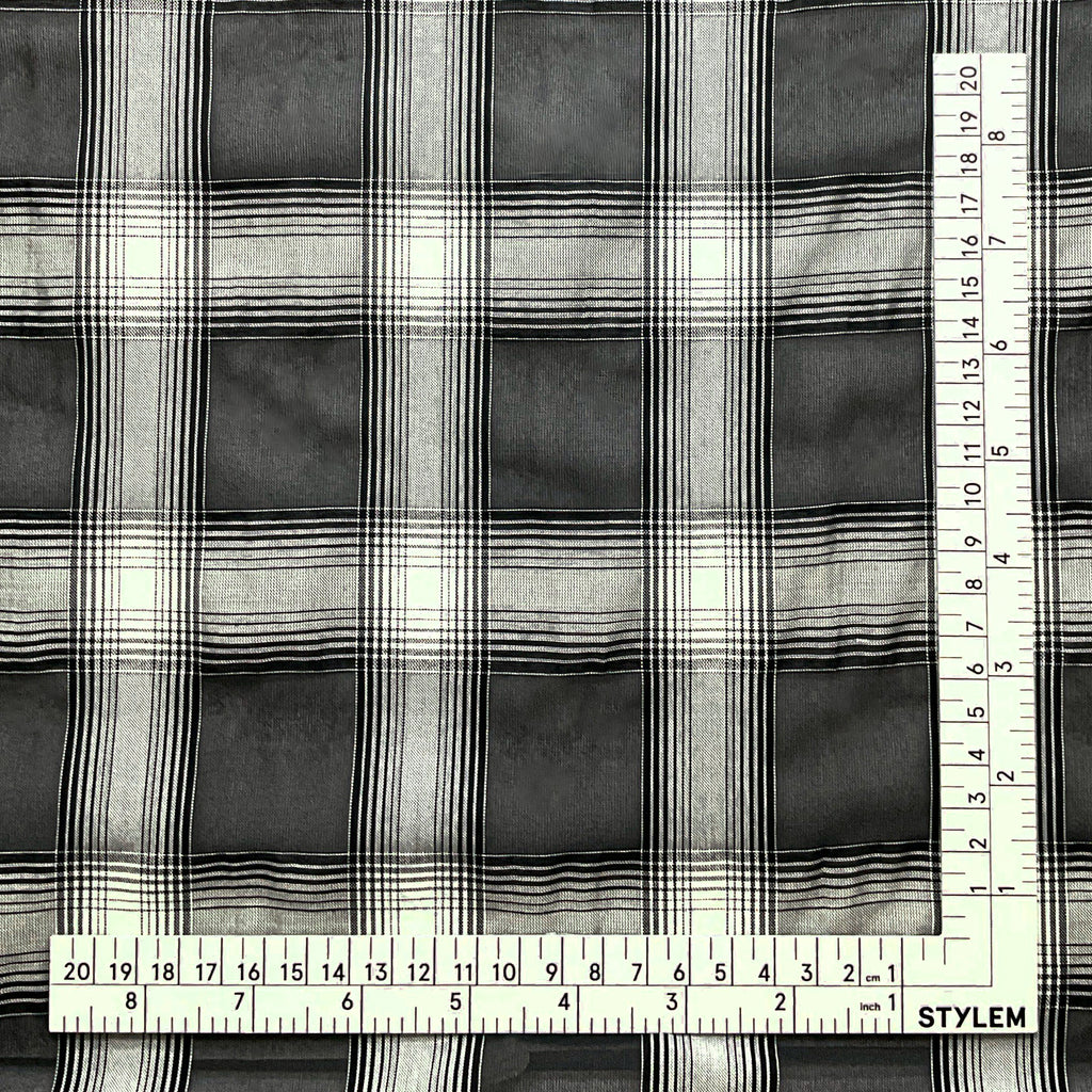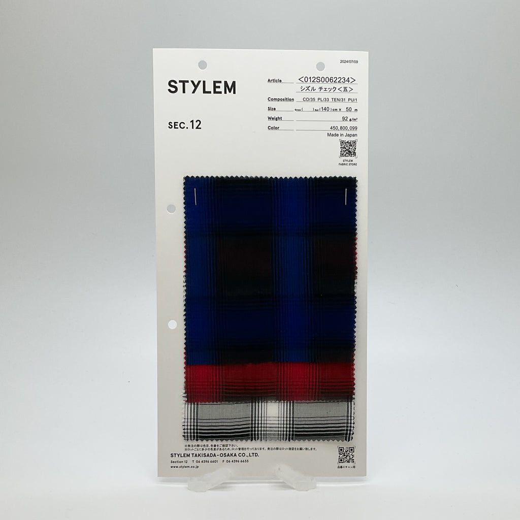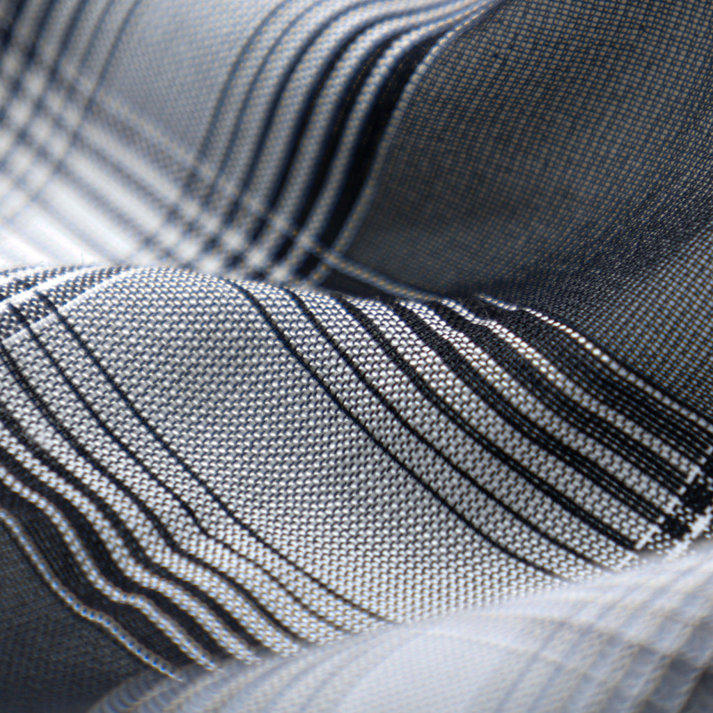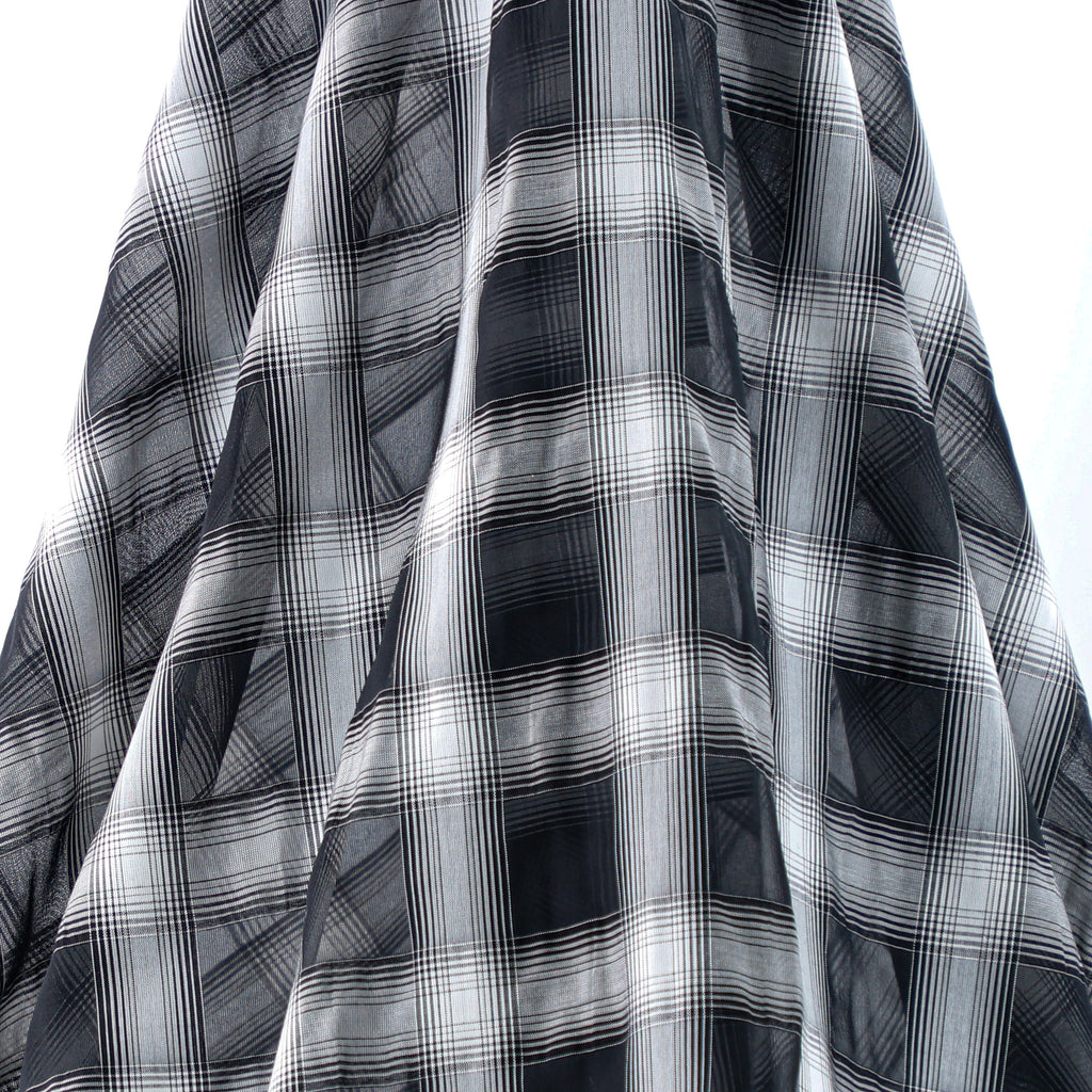 オンブレーチェックのシアー素材。ポリエステルはリサイクルを使用して表面感を ストレッチ糸を使用して立体感を出しています。
