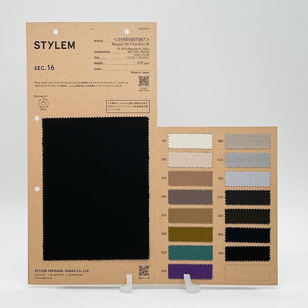 リサイクルポリエステルを使ったポリエステル/ウール/ポリウレタンです。