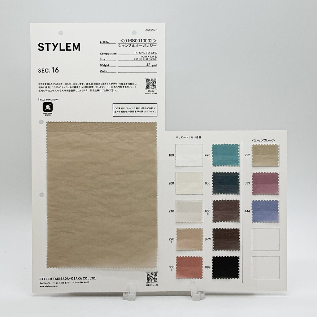 タテ糸に20デニールモノフィラメントを使い、ハリ感、光沢感をだした、繊細なオーガンジーです。染分けでのシャンブレーもできるのも特徴です。
