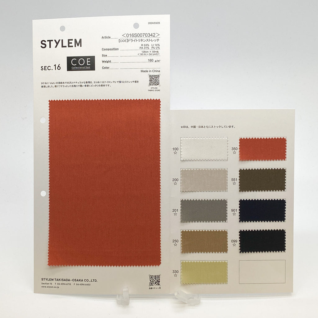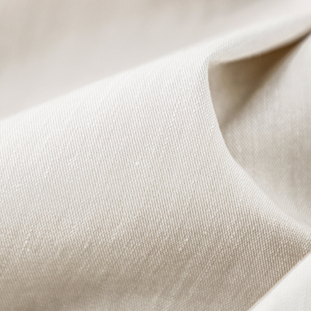 縦糸にヴィスコースリネン、緯糸にナイロンPUを配列しました。 ヴィスコースの光沢、リネンの涼しさとスラブの表情に加え心地よいストレッチ性を兼ね備えています。