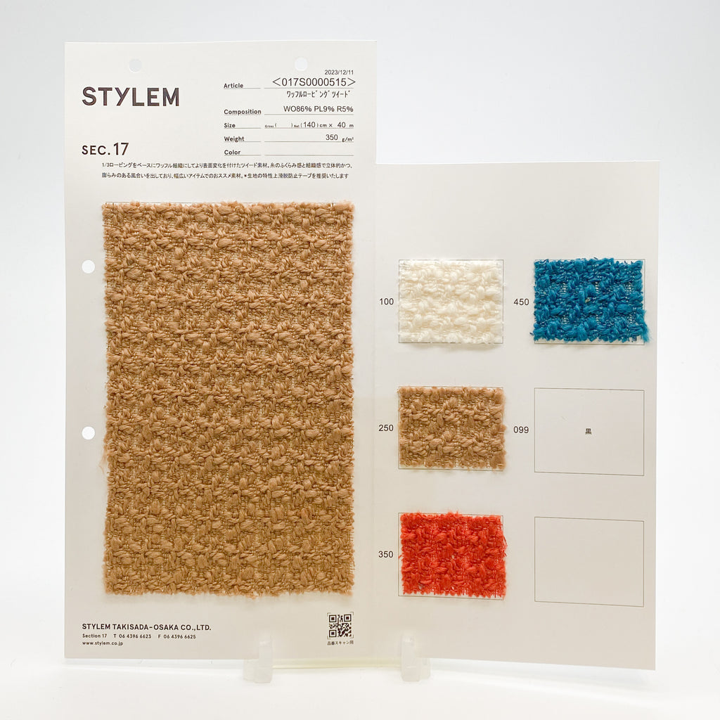 1/3ロービングをベースにワッフル組織にしてより表面変化を付けたツイード素材です。糸のふくらみ感と組織感で立体的、かつ、ふくらみのある風合いを出しており、幅広いアイテムにお使いいただける素材です。