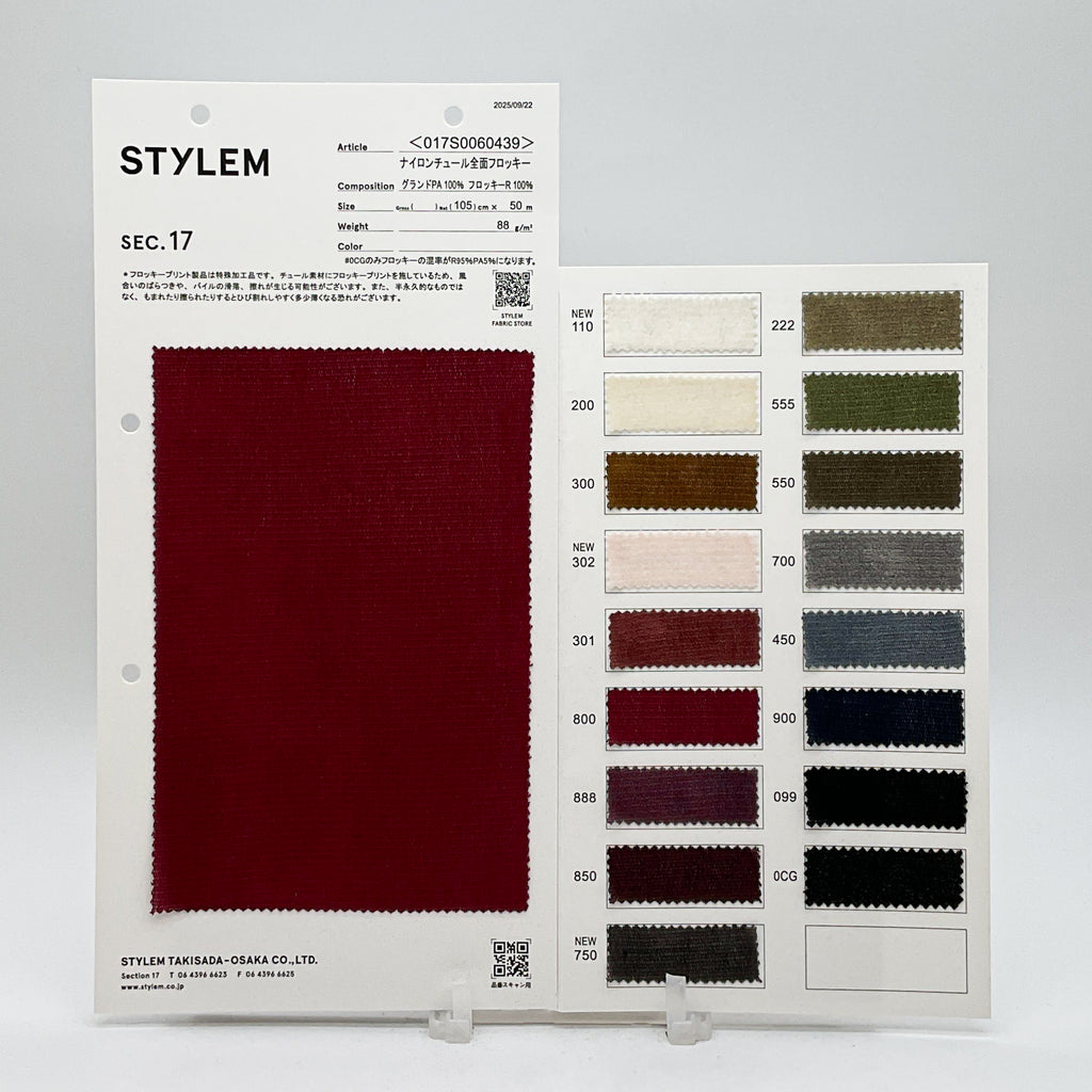 全面にフロッキー加工を施したチュール素材です。単色に加えて、より表情感のあるシャンブレー調のカラーを追加しています。