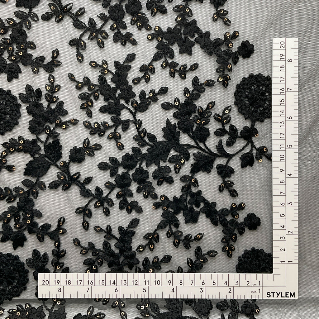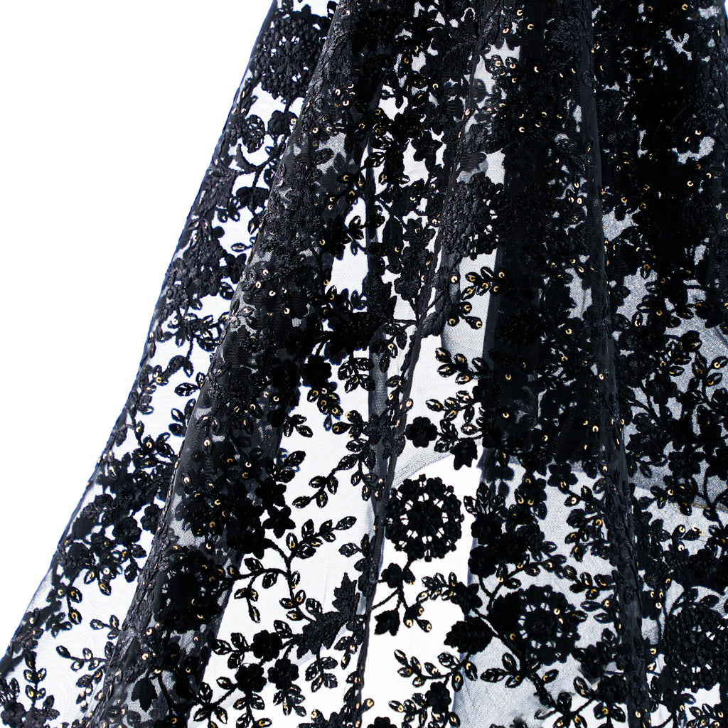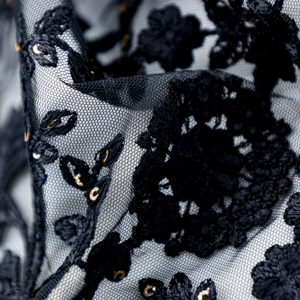 チュールのグランドに小花の刺繍を施した素材です。 アクセントにラメを入れることで高級感を表現した素材です。