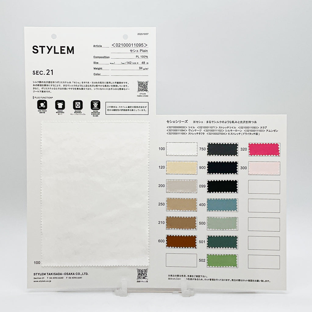 シルク調のポリエステル糸「セシェ」をタテ・ヨコに使用した平織です。異形断面によりシルクのような光沢を表現した軽さのあるイージーケア商品です。※「Seche/セシェ」はユニチカ株式会社の登録商標です。