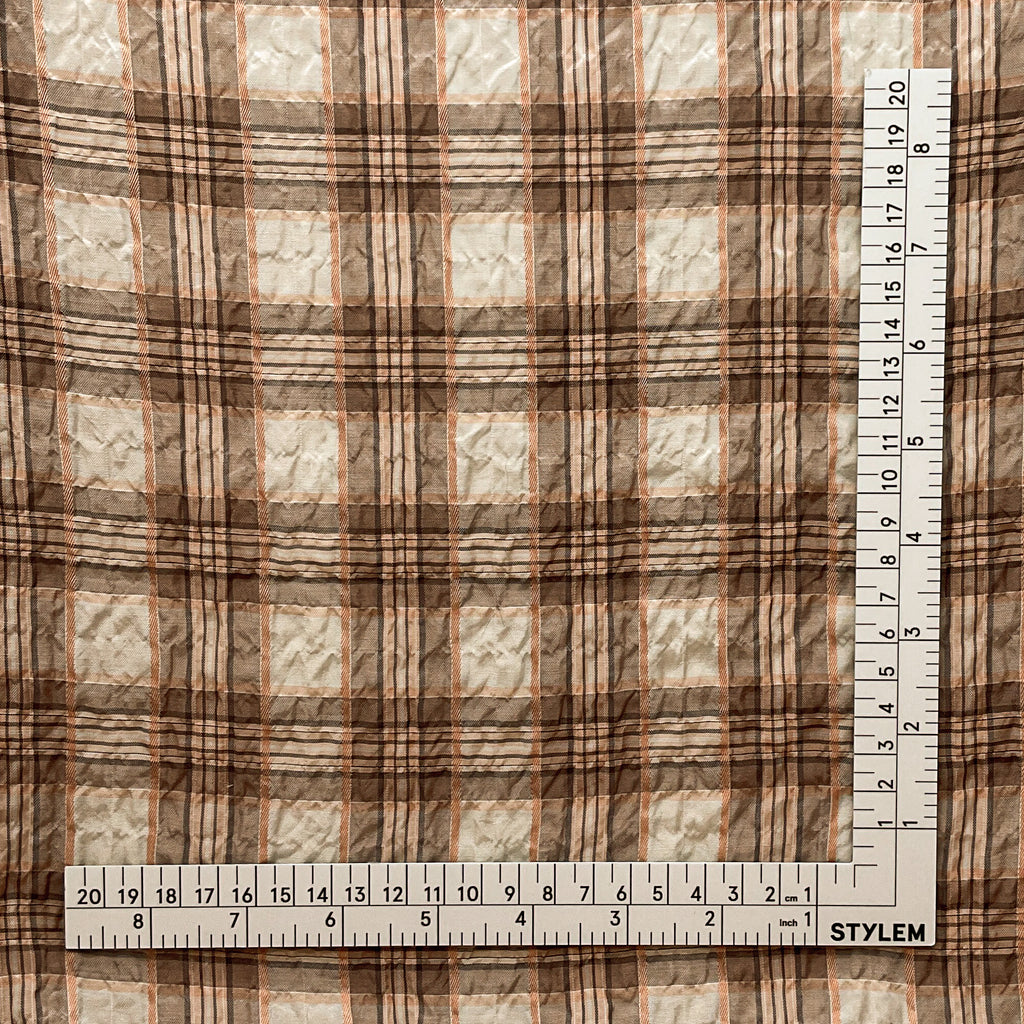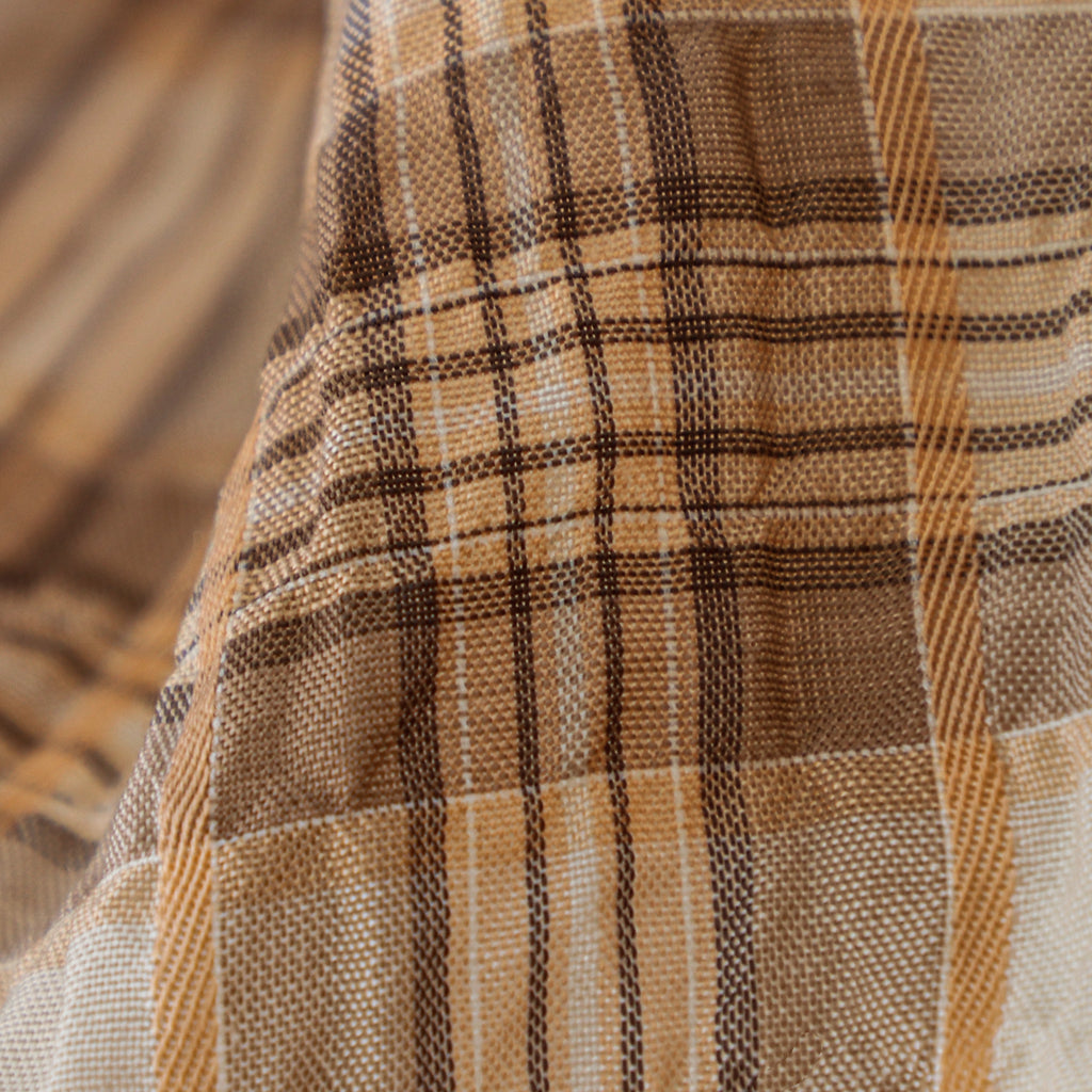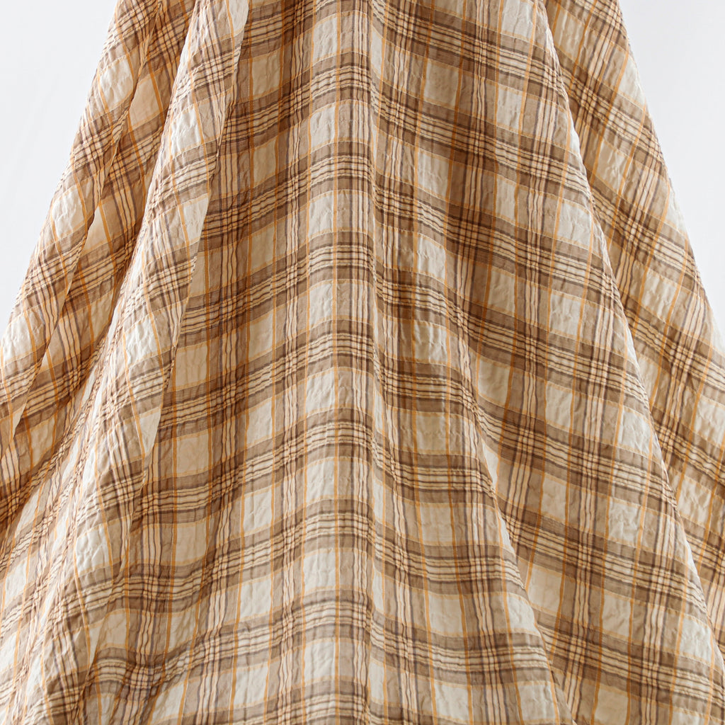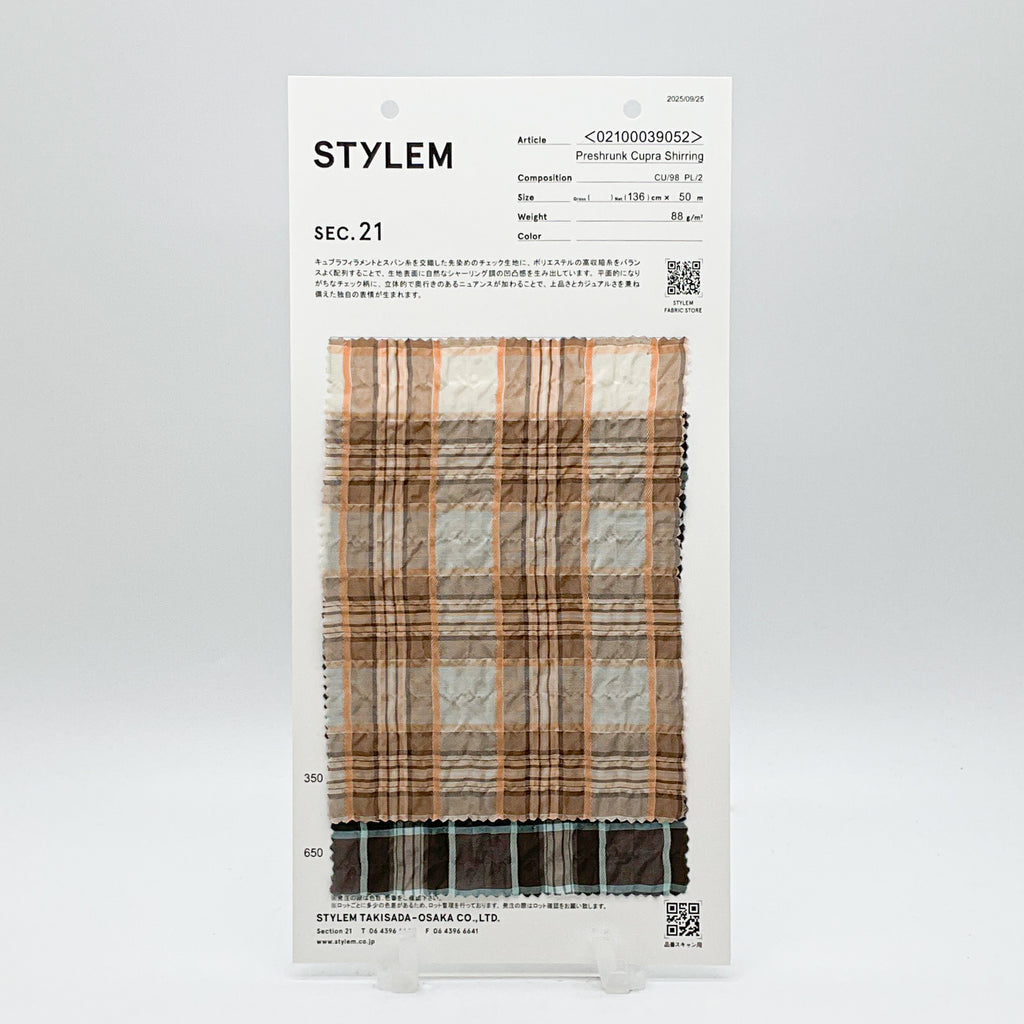 キュプラフィラメントとスパンを交織した先染めチェックにPL高収縮糸を配列する事でシャーリング調の凹凸を表現。 ウォッシャブル加工により手洗い可能。