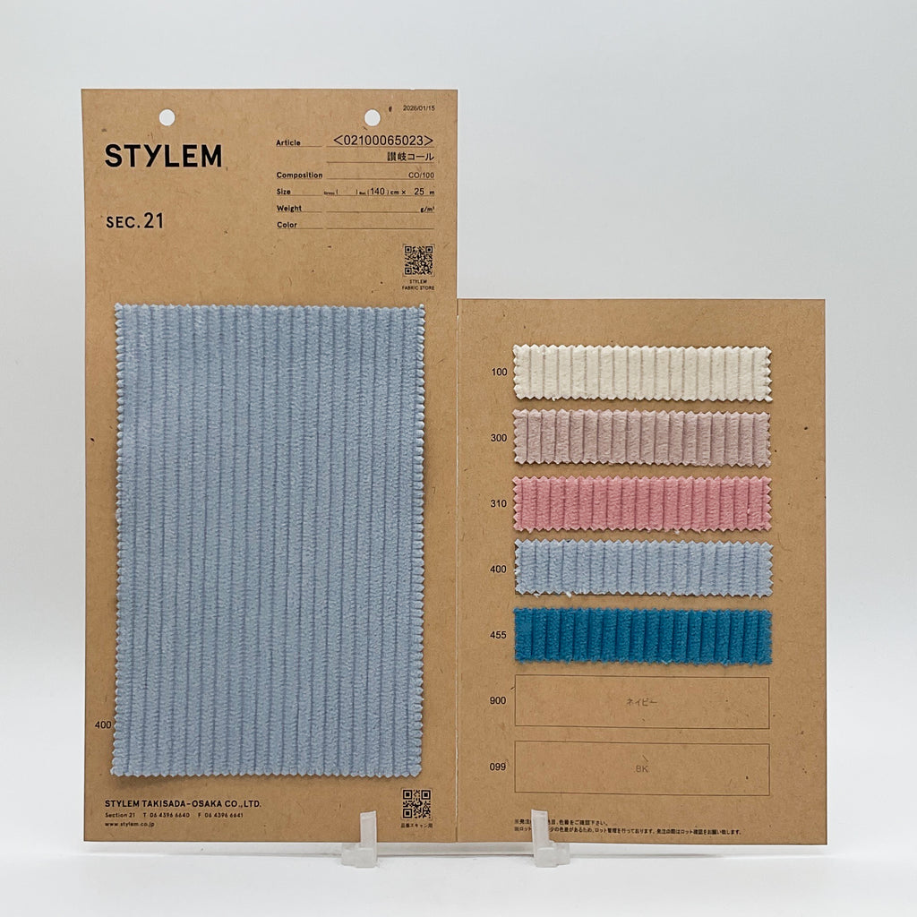 綿100%の5ウエ―ルと太目の畝で企画したコーデュロイ素材。存在感のある太い畝と適度なボリューム感が差別化されています。加工~仕上げまでコーデュロイ加工に特化した㈱富士染工場で行っています。