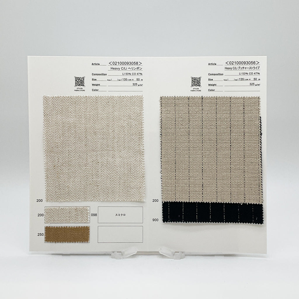 太い糸番手のリネンと綿を交織で織り上げたストライプ柄のブッチャー素材です。生地に表情感と、重厚感が特徴的です。アウターから、パンツ、スカートなどのアイテムに適しています。