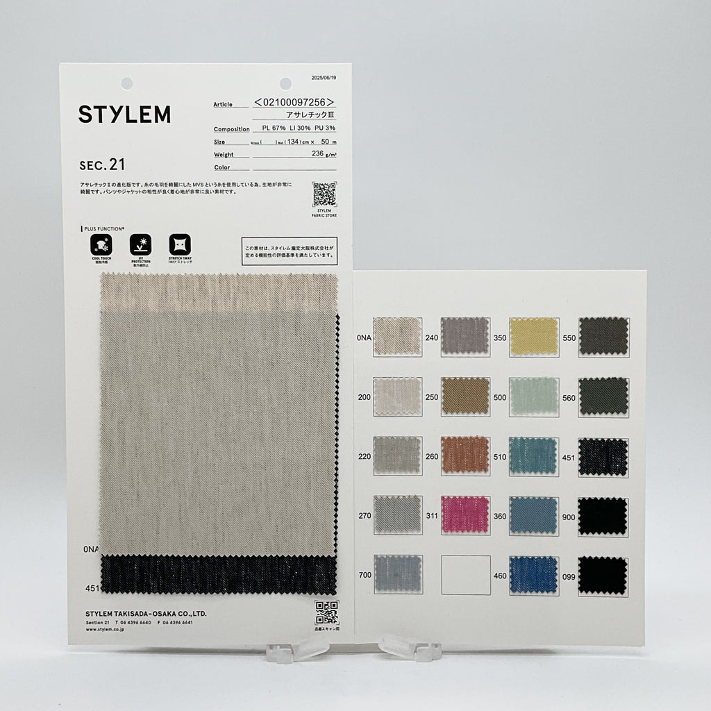 リネンとポリエステルの混紡糸をタテ糸に使用したツイル素材。ヨコ糸にはポリエステルポリウレタンのFTYを使用し、リネン混ながらキックバックがいいボトムス素材です。