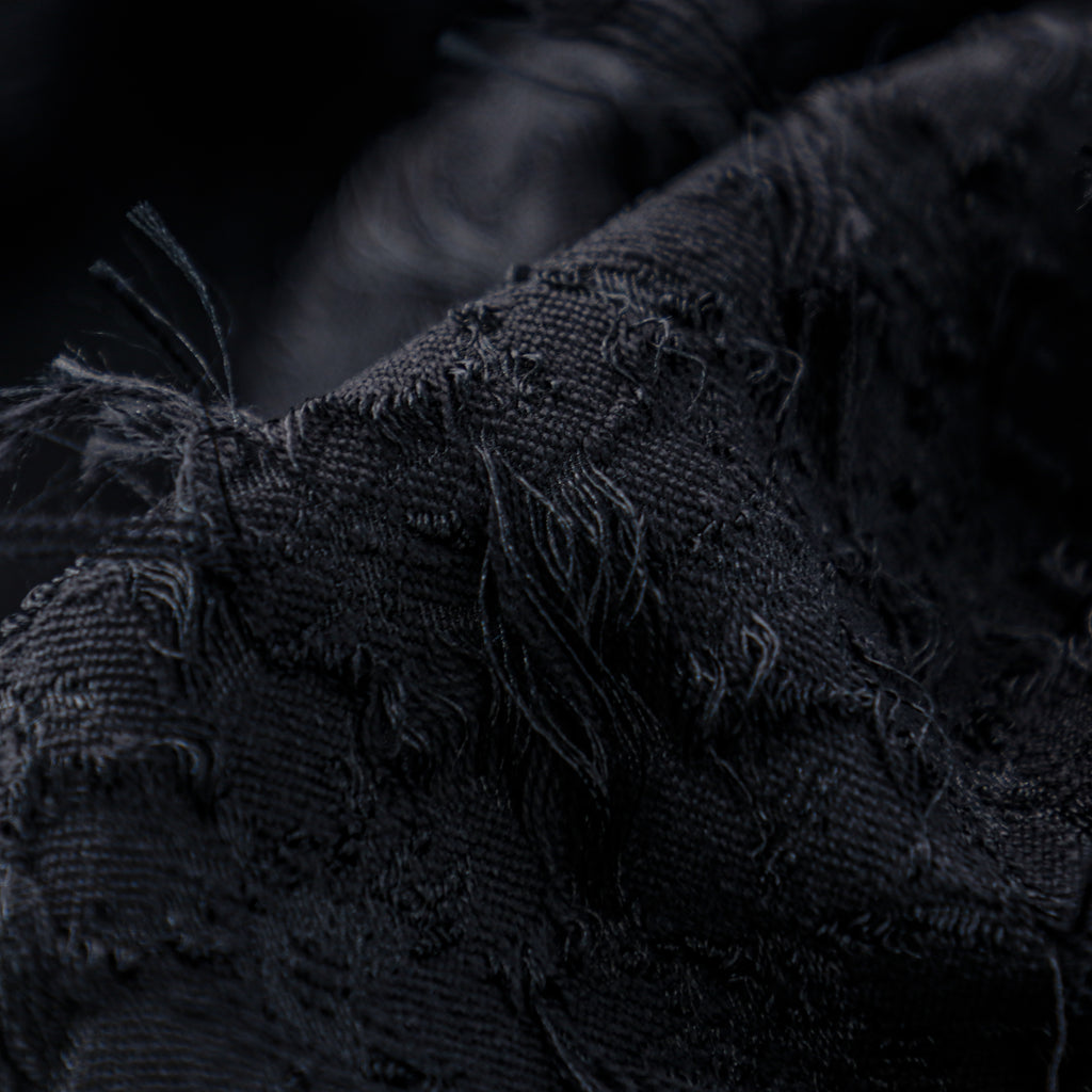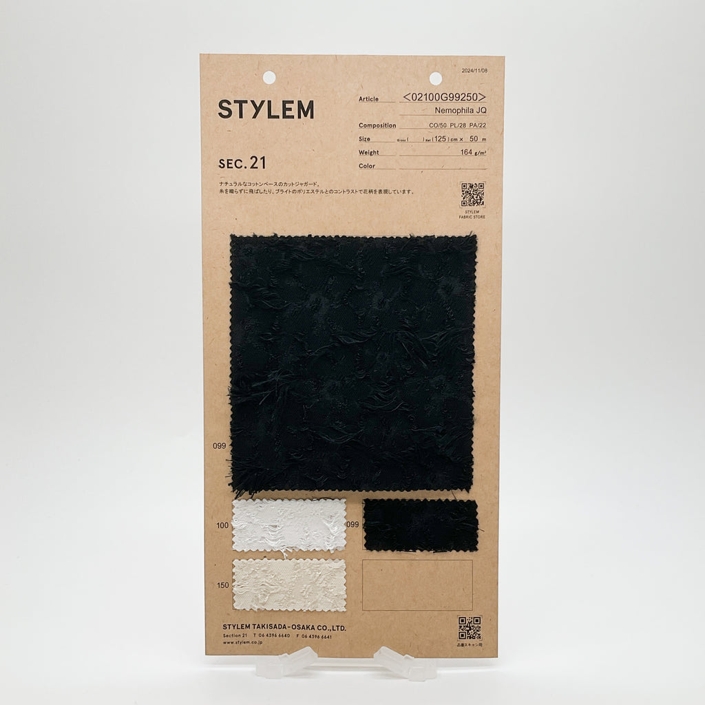 ナチュラルなコットンベースのカットジャガード。 糸を織らずに飛ばしたり、ブライトのポリエステルとのコントラストで花柄を表現しています。
