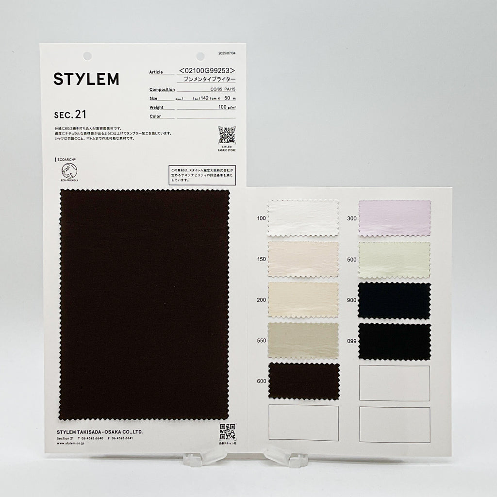 分線に60/2綿を打ち込んだ高密度素材です。適度にナチュラルな表情感が出るように仕上げでタンブラー加工を施しております。 シャツは勿論のこと、ボトムまで作成可能な素材です。