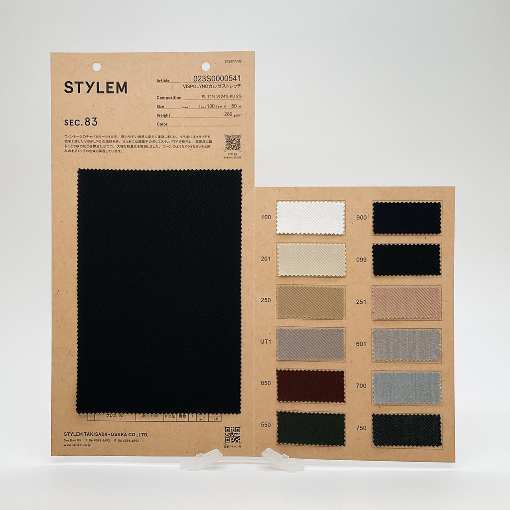 イタリアのヴィスコース/ポリエステル/ポリウレタンサイロ梳毛引きの糸をタテ糸に使用し、フィラメントポリエステルと交織させた2WAYカルゼ素材です。