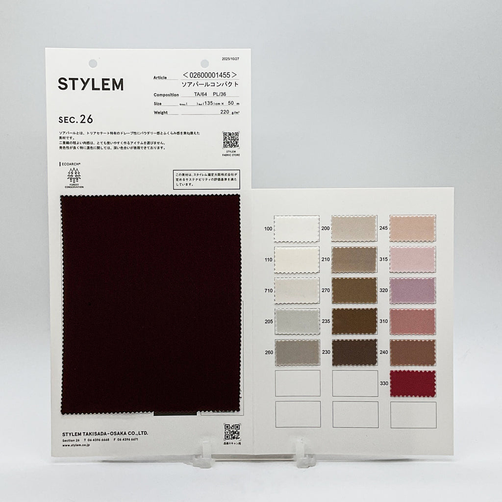 タテ・ヨコ共に、トリアセテートとポリエステル85デニールの合撚糸を使用した二重織です。トリアセテート特有のドレープ性に、ふくらみ感とコンパクト感を持たせました。