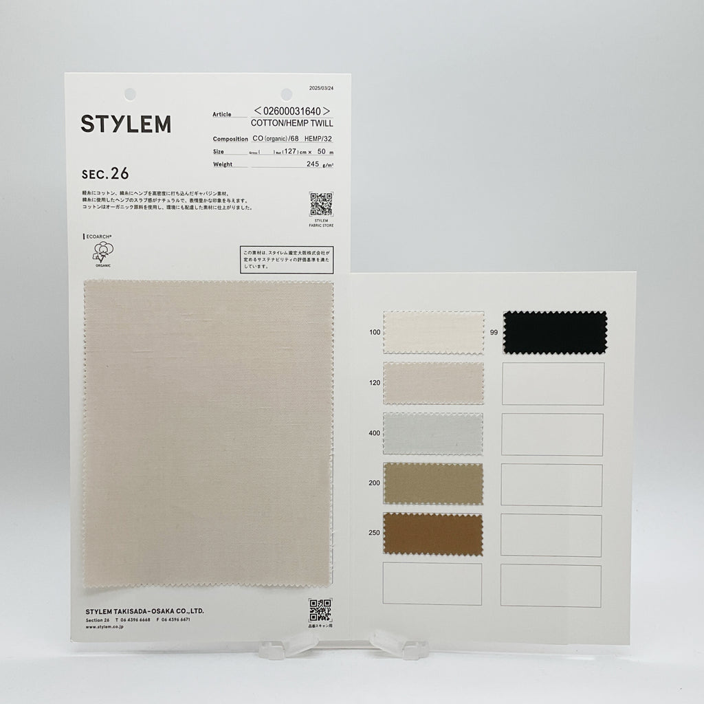 タテ糸にオーガニックコットン40/2 ヨコ糸に36ヘンプを打ち込んだ、綿ヘンプギャバジンです。オーガニックコットンを使用した、高級ナチュラル素材となっています。