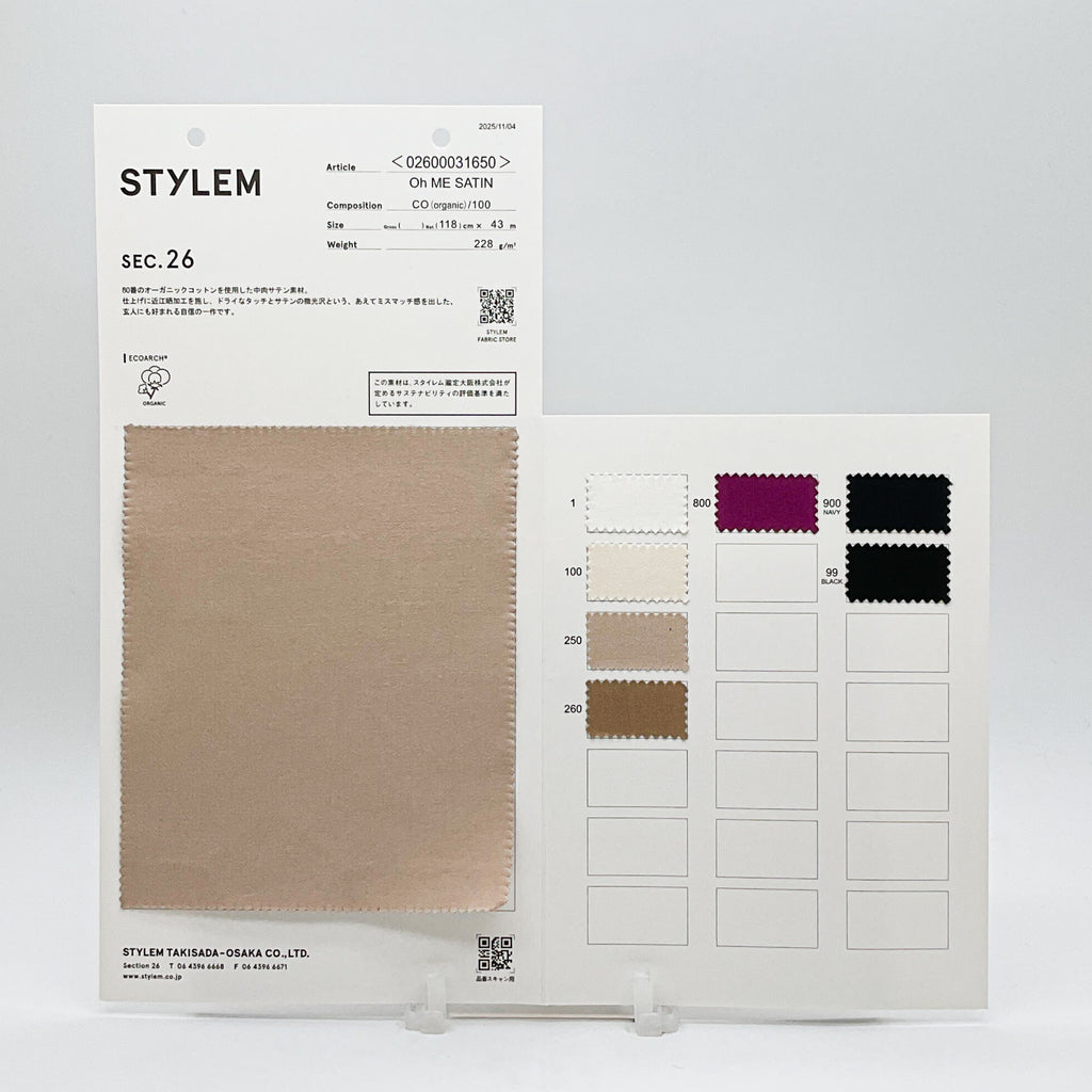 80番の超長綿オーガニックコットンを使用した中肉サテン素材です。仕上げに近江晒加工を施し、ドライなタッチとサテンの微光沢のあえてのミスマッチ感を創り出した玄人好みの自信の1作です。