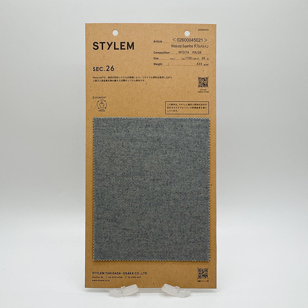 リサイクルウールとリサイクルナイロンを使用した接結二重織メルトンです。スーパー100’s相当の原料を使用し、国内整理で丁寧に仕上げたサスティナブルなメルトン素材です。