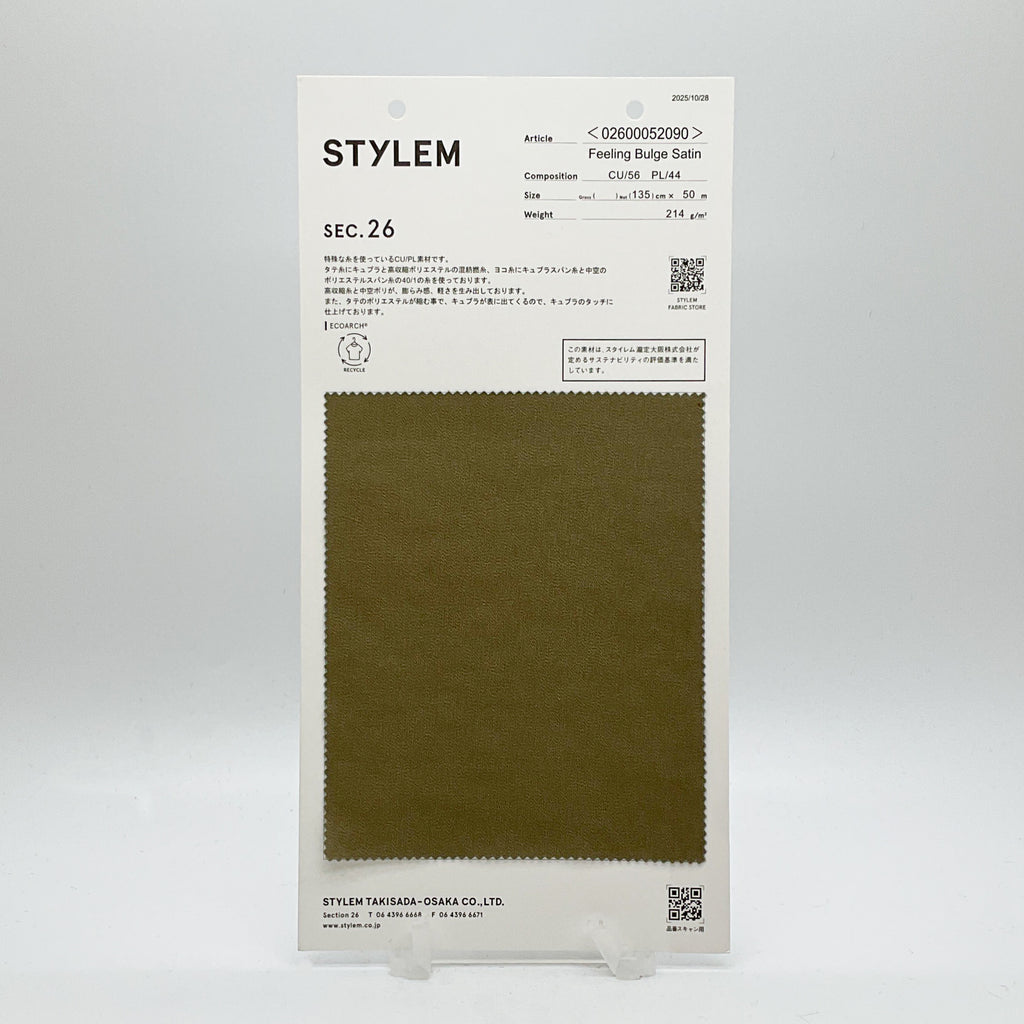 高収縮糸と中空ポリエステルが、ふくらみ感、軽さを生み出しています。タテのポリエステルが収縮する事で、キュプラが表に出てくるので、キュプラのタッチに仕上げています。