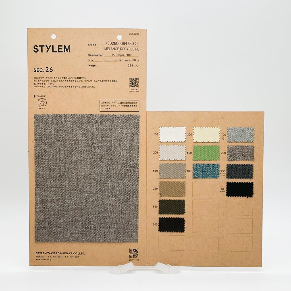 300デニールのリサイクルポリエステルを100%使用したツイル素材です。ウールのトップ糸のようなメランジ感を表現しています。