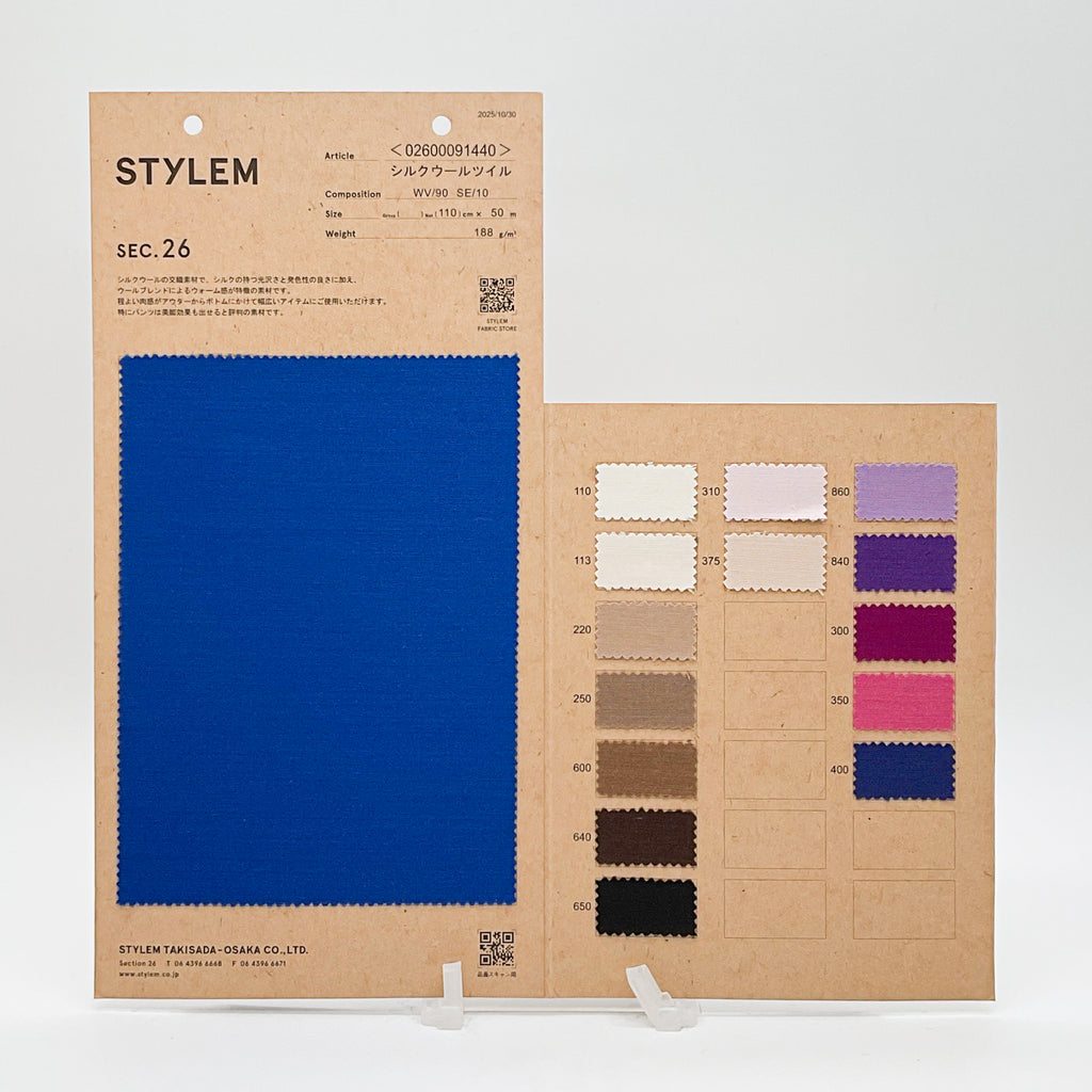 タテ糸にシルク、ヨコ糸にウールを打った中肉素材です。シルク使いによる光沢と適度なハリ感で、美しく高級感のあるシルエットを演出します。