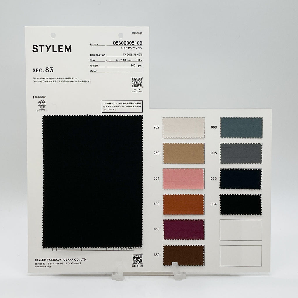 シルクのシャンタンをトリアセテートで表現しました。 シルクのような繊細で上品な光沢感や膨らみが特長の素材です。
