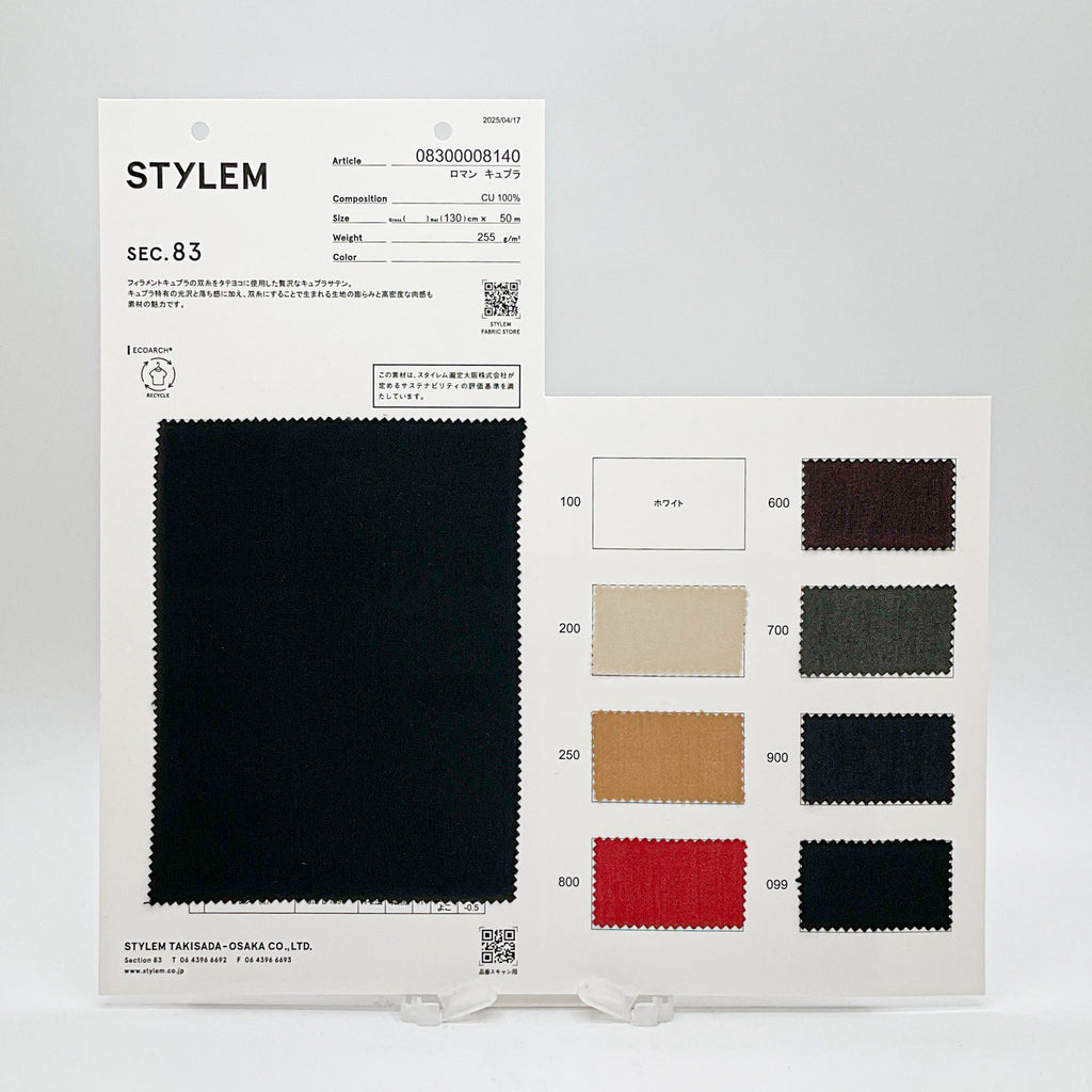 フィラメントキュプラの双糸をタテヨコに使用した贅沢なキュプラサテン。 キュプラ特有の光沢と落ち感に加え、双糸にすることで生まれる生地の膨らみと高密度な肉感も素材の魅力です。
