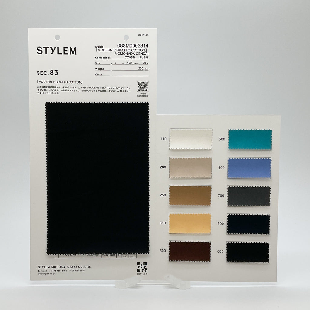 天然繊維を天然繊維でないようなタッチにした、83課のMODERN VIBRATTO COTTONシリーズ。 サテンストレッチの生機に桃肌現代加工を施し、合繊のような質感や反発感がありながら、繊細なピーチタッチに仕上げました。