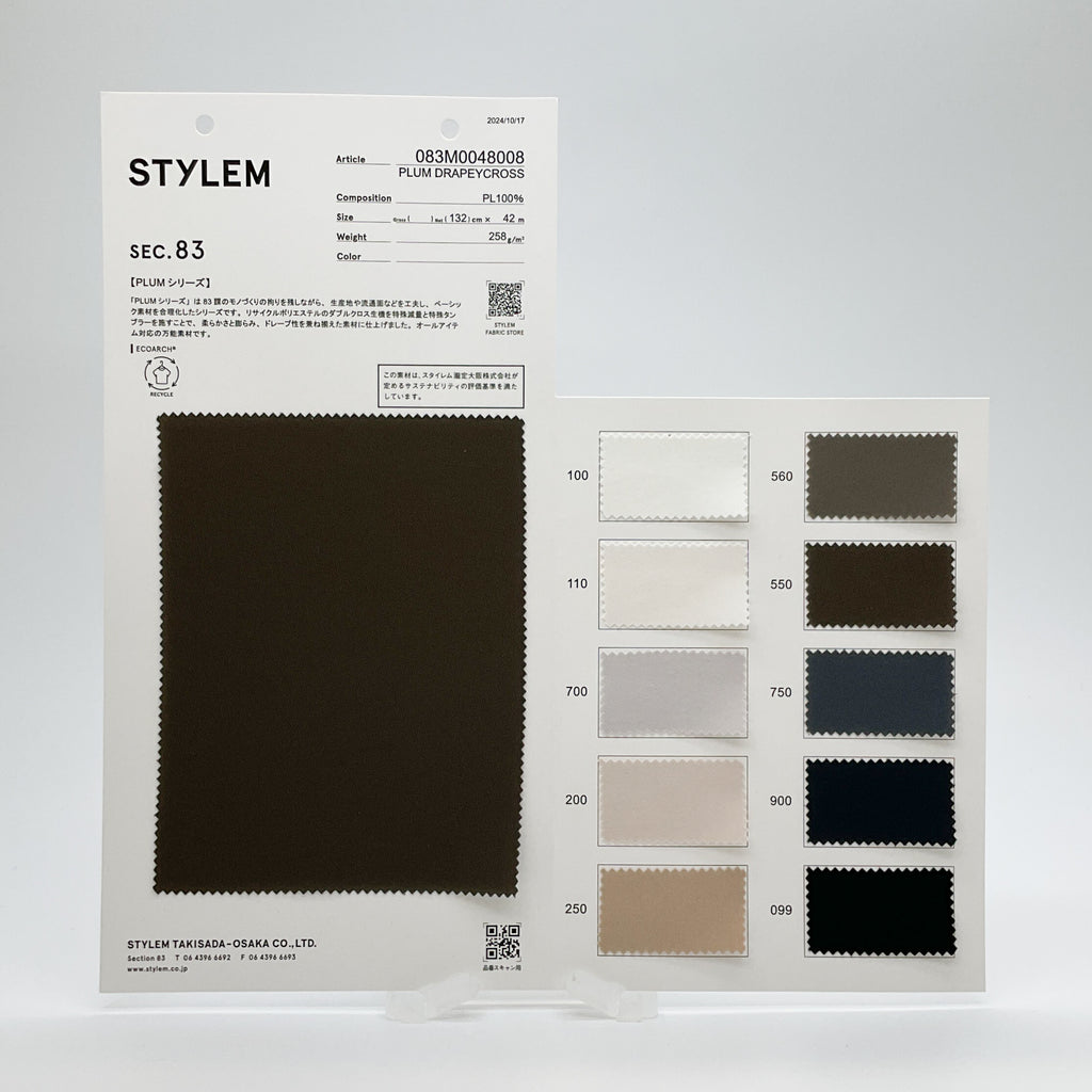 「PLUMシリーズ」は83課のモノづくりの拘りを残しながら、生産地や流通面などを工夫し、ベーシック素材を合理化したシリーズです。 リサイクルポリエステルのダブルクロス生機を特殊減量と特殊タンブラーを施すことで、柔らかさと膨らみ、ドレープ性を兼ね揃えた素材に仕上げました。