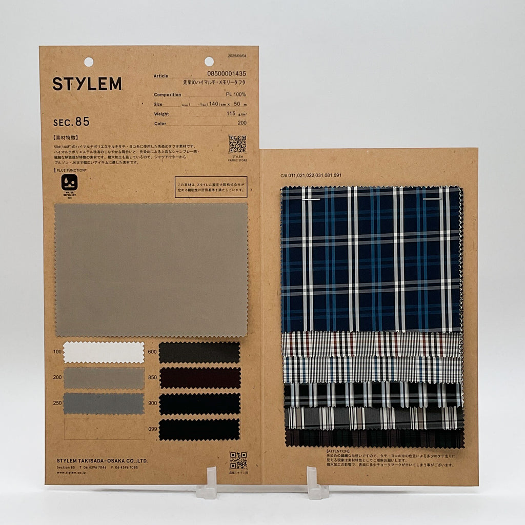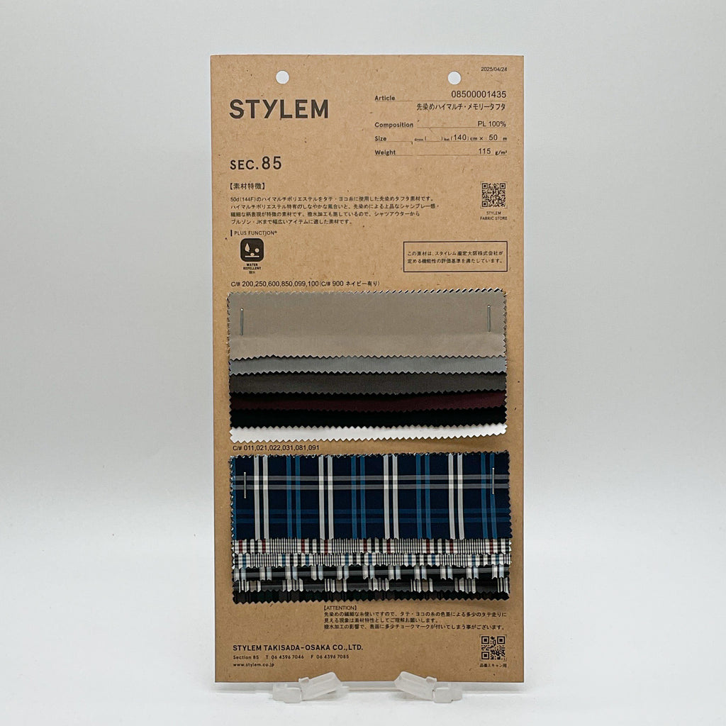 50d(144F)のハイマルチポリエステルをタテ・ヨコ糸に使用した先染めタフタ素材です。しなやかな風合いと、先染めによる上品なシャンブレー感・繊細な柄表現が特徴の素材です。撥水加工も施しているので、シャツアウターからブルゾン・JKまで幅広いアイテムに適した素材です。