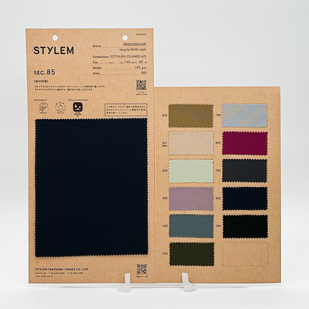 70デニールのリサイクルナイロンの糸と、オーガニックコットンの糸で織り上げたサステナブル素材です。撥水加工も施しています。
