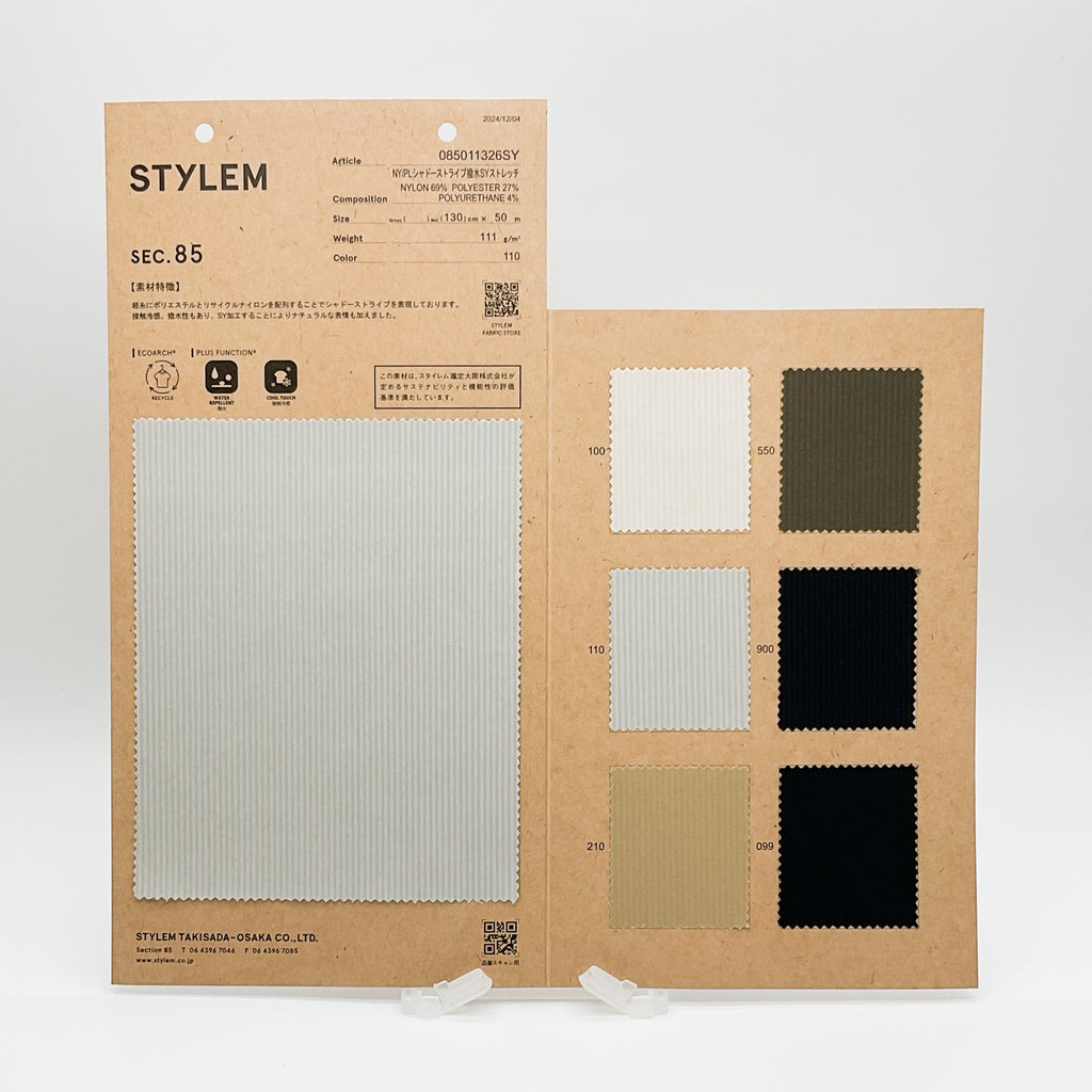 経糸にリサイクルナイロンとポリエステルを配列することでシャドーストライプを表現しております。 接触冷感、撥水性もあり、SY加工することによりナチュラルな表情も加えました。